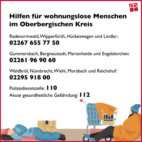 Wohnungslose Menschen erkennt man oft daran, dass sie mehrere Taschen, Rucksäcke oder einen Schlafsack mit sich führen. Auch auf Personen, die in Hauseingängen, an Bahnhöfen oder Bushaltestellen schlafen, sollte man achten. Gleiches gilt für Personen, die man regelmäßig im Freien antrifft, die immer wieder im Freien sitzen und sich dort den ganzen Tag aufhalten Bürger sollten in solchen Fällen die Beratungsbüros in Wipperfürth, Waldbröl und Gummersbach anrufen oder eine Mail schreiben.