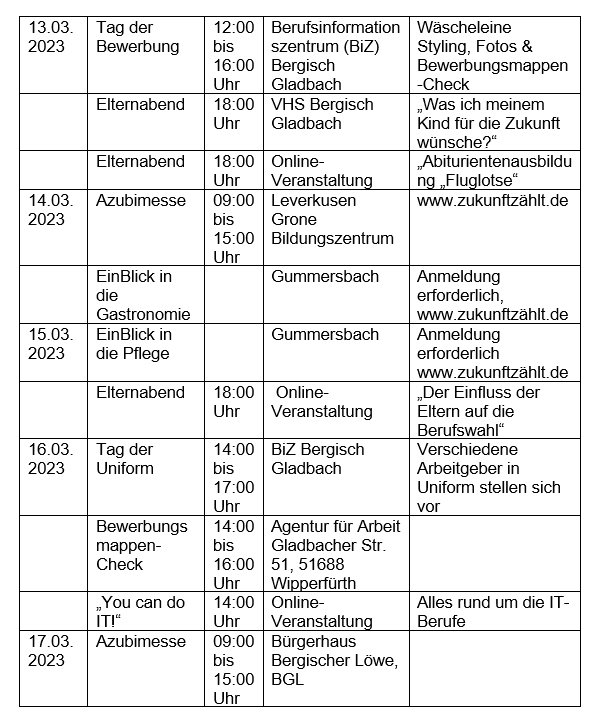 Ein Bewerbungstag, ein „Tag der Uniformen“, Einblicke in die Berufe der Gastronomie und der Pflege, zwei Messen in Bergisch Gladbach und Leverkusen, „Wäscheleine“ mit offenen Ausbildungsberufen, Bewerbungsmappen-Check, kostenlose Bewerbungsfotos und Vieles mehr.