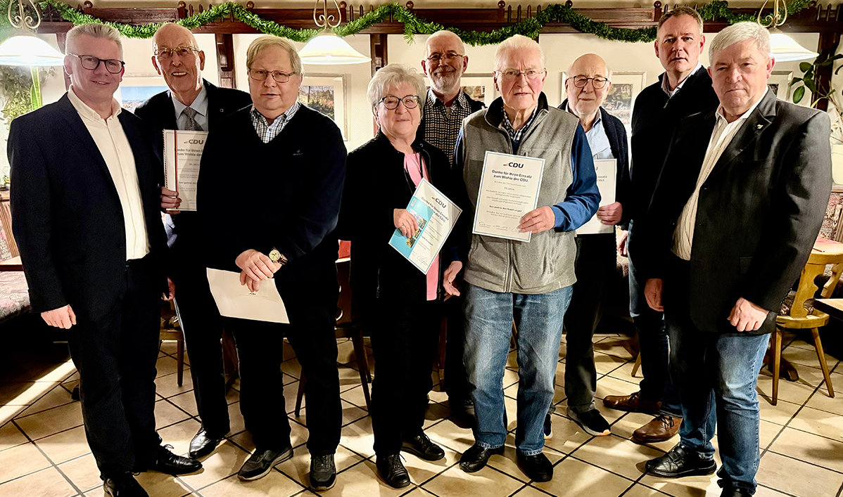 Im Rahmen der Jahreshauptversammlung wurden auch einige Mitglieder der CDU-Lindlar geehrt. Für ihre 25-jährige Mitgliedschaft in der CDU wurden Achim Fischer, Brigitte Hochscherf, Edgar Frangenberg, Hedi Leugner, Willi Hönen und Friedhelm Stellberg geehrt. Seit 40 Jahren Mitglied in der CDU sind Rolf Willi Kellershohn und Gertrud Eschbach, Rudolf Langen wurde für seine 50-jährige Mitgliedschaft ausgezeichnet. Erich Eschbach, Hans Fischer und Hans-Hermann Röttgen wurden sogar für 60 Jahre Mitgliedschaft in der CDU geehrt.