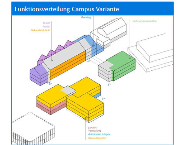 Aus vier verschiedenen Modellen empfehlen die Planer und die Stadt nun die Variante „Campus“. Andere Ideen erhielten im Bewertungsprozess zum Beispiel aufgrund der Kosten oder der umfangreicheren Baumaßnahme Minuspunkte, auch die Topografie – von Hauptstraße bis zum oberen Schulbereich geht es rund 15 Meter hoch – stellte Herausforderungen dar. „Bei der Campus-Variante haben wir das beste Verhältnis von Nutz- und Baufläche“, sagte Peter Madel – außerdem blieb man nur mit dieser Variante im Gesamtbudget. Bei der Campus-Variante erhält jeder der drei bestehenden Gebäude Anbauten, auf eine Aufstockung kann komplett verzichtet werden. Großes Plus: „Es entsteht eine erlebbare Campusmitte im Zentrum des Schulgeländes“, so von Heydebrand. Diese Mitte solle auch dementsprechend gestaltet werden.