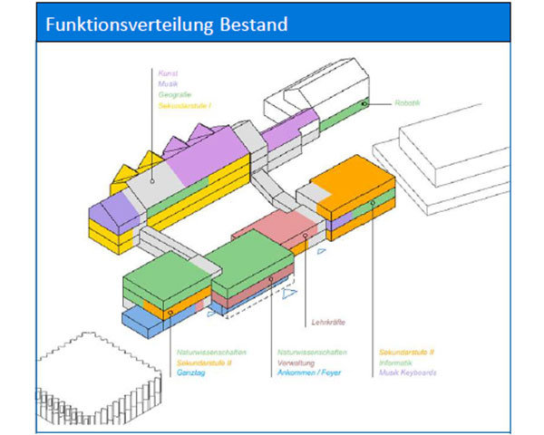 [Grafiken: PVMA hks Architekten --- Noch sind einige Bereiche des Gymnasiums wie die Naturwissenschaften (grün) oder die Sekundarstufe II (orange) in den Bestandsgebäuden verteilt. Mit der Sanierung und den Anbauten soll nun eine Neuordnung vonstatten gehen.