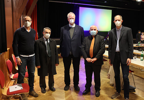 [Michael Kalisch (v.l.n.r.), Recep Özaydin, Christoph Bersch, Fetin Karaca und Manuel Lüling setzten ein Zeichen für den Frieden in der Ukraine.]