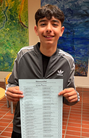 Unter den Politikinteressierten ist auch Deniz (Foto rechts). Dem Achtklässler ist es wichtig, bald auch im realen Leben politisch mitzubestimmen und verfolgt die weltpolitischen Ereignisse wie Ukraine- und Gazakrieg mit großem Interesse. „Ich freue mich, schon jetzt eine Stimme zu haben“, so der 14-Jährige. Bei Kommunal – und ebenjener Europawahl darf man ab 16 Jahren politisch teilhaben. „Erstmalig können auch die Siebtklässler bei uns wählen“, berichtet Lehrerin Alexandra Breu, dass man an der Schule auf das Herabsetzen der realen Wahlberechtigung reagiert habe. „Politische Teilhabe wird bei uns sehr großgeschrieben“, wirbt auch Schulleiter Ingolf Weber für die Wichtigkeit, junge Menschen so früh wie möglich zur politischen Teilhabe zu motivieren.