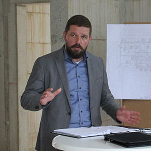Der Kampfmittelräumdienst musste anrücken. Gefunden wurden auf dem Areal aber keine Bomben, sondern Altlasten, die aufwendig und teuer entsorgt werden mussten. Auch Wasser war ein großes Thema bei den Planungen. Zum einen liegt das Gebäude im Tal. Bei Starkregenereignissen ist es sehr exponiert, eine dreiteilige Rinne soll nun eine gezielte Notentwässerung erreichen. Zum anderen verläuft die Agger auf der anderen Seite. Um den Hochwasserschutz sicherzustellen, wurden laut Ammann 800 Rüttelstopfpfeiler per Tiefenbohrung in den Boden geführt und nachträglich verdichtet. „Das Gebäude steht praktisch auf diesen Säulen“, sagt Felix Ammann (Foto).