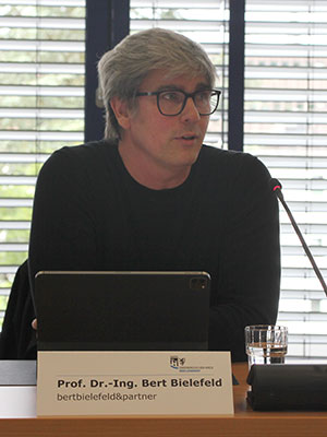 Prof. Dr. Bert Bielefeld ist Professor für Baumanagement und Bauökonomie an der Universität Siegen, außerdem Mitglied im Normungsausschuss der DIN 276 – Kosten im Hochbau und Mitglied im Beirat des Baukosteninformationszentrums für Architekten. Bei der Prüfung habe es mehrere Schritte gegeben. In einem ersten Schritt habe er die reinen Baukosten verglichen mit hinterlegten Projekten in einer bundesweiten Baukostenstatistik. Das Ergebnis sei als „Benchmark“ zu verstehen: „Für ein Verwaltungsgebäude bewegen wir uns hier im gesunden Mittelmaß, es ist ein normales Gebäude geplant.“ Anschließend sei er die einzelnen Positionen der Planung durchgegangen. „Die Einschätzung bleibt danach aber ähnlich.“ Besonders die Lage am Hang habe Auswirkungen auf den Preis. „Das gehört in dieser Gegend auch dazu.“ Die vorgesehenen Maßnahmen, um damit umzugehen, seien „legitim“.
