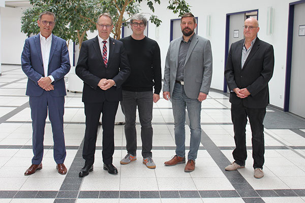 [Sie stellten die Ergebnisse der Kostenprüfung vor (v.li.): Rainer Schmidt (BMP Baumanagement), Landrat Jochen Hagt, Prof. Dr. Bert Bielefeld, Baudezernent Felix Ammann und Volker Müller.]