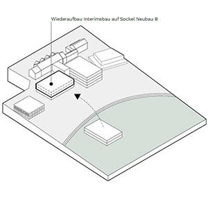 Das Fazit: Die Varianten Zug-um-Zug und die Verlegung der Hauptstraße fallen weg (OA berichtete). Stattdessen soll die optimierte Wettbewerbslösung des Büros pvma weiterverfolgt und noch weiter auf Einsparpotenziale durchleuchtet werden. Um die notwendigen Interimskosten (bis zu 16,6 Millionen Euro bei Komplettauslagerung) zu drücken, soll die Idee von pvma weiter geprüft werden, ob die Basis eines Interimsgebäudes in Holzbauweise als Neubauteil für das Gymnasium genutzt werden kann, sobald es den Zweck als Übergangslösung erfüllt hat (Grafik). Zugleich soll bei der Wettbewerbsvariante geprüft werden, ob noch mehr als 50 Prozent saniert werden können. Die Verwaltung schlug darüber hinaus vor, parallel ein Sanierungskonzept zu prüfen, falls die verbliebende Variante vor allem finanziell nicht darstellbar sein sollte. Noch liegen die geschätzten Baukosten dafür bei allein 66,5 Millionen Euro. Bürgermeister Ulrich Stücker wies zugleich darauf hin, dass alle bisher genannten Zahlen angesichts der dynamischen Entwicklungen an den Märkten eigentlich „nur falsch sein können“.