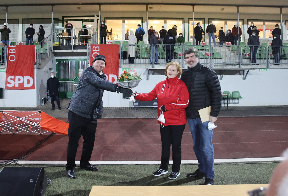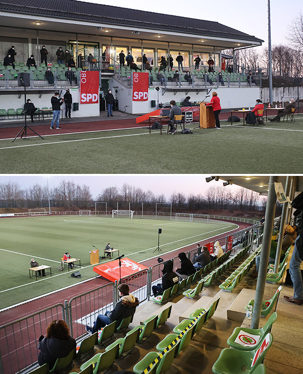 [Die Wahlkreisdelegiertenkonferenz der SPD Oberberg fand erstmals als Freiluftveranstaltung im Bergneustädter Wilhelm Bisterfeld-Stadion statt.]