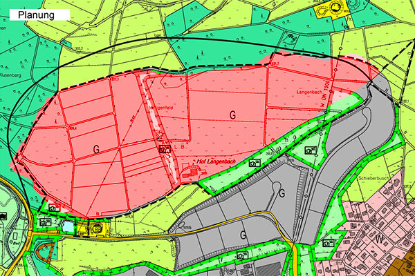 [Grafik: Marktstadt Waldbröl, OAG --- Die rot markierte Fläche zeigt etwa die Ausmaße der Erweiterung des Industrieparks, die graue Fläche den Bestand.]