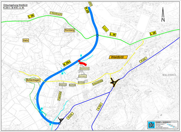 Besonderheiten: Die Anbindung zum Schulzentrum erfolgt über diese Straße durch eine Abzweigung, die in einer großzügigen Hol- und Bringzone münden soll. Auf der eigentlichen K 28n geht es von der Abzweigung Richtung Bohlenhagen, das nicht an die neue K28n angeschlossen wird. Die Bohlenhagener Straße würde per Brücke über der K28n laufen, die neue Straße dort 4,5 Meter tiefer liegen – das bringt mehr Lärmschutz, so Donner. Weitere Lärmschutzmaßnahmen würden noch geprüft. Auf die B 478 würde die neue K28n direkt neben dem bestehenden Kreisverkehr (Talstraße, Brölstraße) treffen. Ein zweiter Kreisel würde geschaffen, der mit dem bestehenden verbunden werde. Je nach Einfahrt und Ziel müssen also zwei Kreisel durchfahren werden, um zur gewünschten Ausfahrt zu gelangen. Die K28n soll einen Geh/Radweg ebenso bereithalten wie zwei 3,50 Meter breite Fahrspuren. Es kommt also eine „üppige Breite“ zusammen.