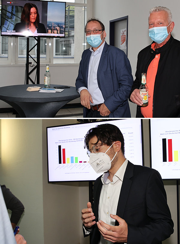 Im Vergleich zu Dr. Brodesser strahlte Engelmeier fast wie ein Honigkuchenpferd, obwohl sie persönlich das Rennen um das Direktmandat verloren hatte. „Ich grinse schon den ganzen Abend!“ Es sei „unfassbar“ gewesen, wie die SPD in den vergangenen Wochen aufgeholt hat. „Scholz wird Kanzler und das ist großartig“, zeigte sie sich überzeugt. Dieses Ergebnis sei ihr im Moment auch wichtiger als die Antwort auf die Frage, ob es für sie doch noch für Berlin reicht. Morgen früh um 6 Uhr wird sie im Zug in die Hauptstadt fahren für einen Termin. Sie hofft, dass sie bis dahin Bescheid weiß. Aufgrund der hohen Zahl an Briefwählern – im Oberbergischen Kreis wurden 69.150 Wahlscheine beantragt (2017: 41.143) – wird damit gerechnet, dass die Auszählung noch lange dauert.