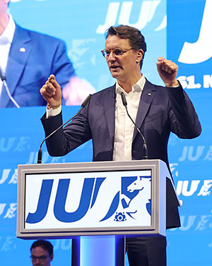 [„Seid fordernd, frech und zumutend wie eure Vorgänger“, appellierte NRW-Ministerpräsident Hendrik Wüst an die Delegierten, sich aktiv an der Gestaltung des politischen Lebens zu beteiligen.]