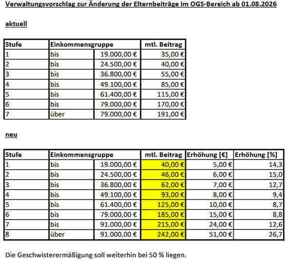 Auf Grund der steigenden Kosten des OGS-Betriebes durch Gehaltserhöhungen des Betreuungspersonales, Steigerung der Sachkosten sowie Änderungen in Bezug auf die Schließzeiten innerhalb der Ferien, sei eine Erhöhung der Elternbeiträge zum kommenden Schuljahr nunmehr notwendig. Die Steigerung des Höchstbeitrages im Vergleich zur aktuellen Satzung liegt mithin bei 26,7 Prozent. Um die Eltern finanziell nicht über Gebühr zu belasten, wurde neben der Anpassung der monatlichen Beiträge innerhalb der verschiedenen Beitragsgruppen die Grenze für die Zahlung des Höchstbeitrages von vormals 79.000 auf 91.000 Euro angehoben. Dies berücksichtige die Entwicklung der Inflation der vergangenen Jahre und lasse auch weniger Familien den Höchstbetrag zahlen.