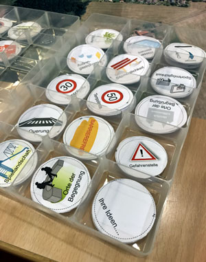 An vier großen Luftbildern konnten die Bürger anschließend mit Stift und Papier sowie Symbolen, etwa Tempolimit oder Querungshilfe, ihre Wünsche darstellen. Die sogenannten Planungsinseln beschäftigten sich mit den Themen Mobilität, den Grün- und Freizeitanlagen zwischen Ortskern und Freilichtmuseum sowie dem Bereich im das 2T-Areal.