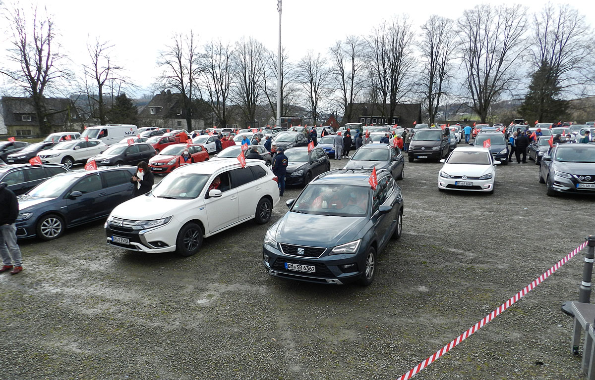 Hupen statt gemeinsames Klatschen, Daumen hoch statt Fahnen. Dass gewerkschaftlicher Protest auch unter Pandemie-Bedingungen funktioniert, zeigte die IG Metall am heutigen Nachmittag auf dem Gummersbacher Steinberg. Der Schützenfestplatz war prall gefüllt mit Gewerkschaftern, die in ihren Fahrzeugen saßen und über ihr Autoradio die Rede von Oberbergs oberstem Metaller Werner Kusel verfolgten. 8.500 Kollegen hatten heute in ihren oberbergischen Betrieben, sogar im Homeoffice früher Feierabend gemacht und damit gezeigt, dass man kampfbereit ist, um eine Lohnforderung von vier Prozent durchzusetzen.