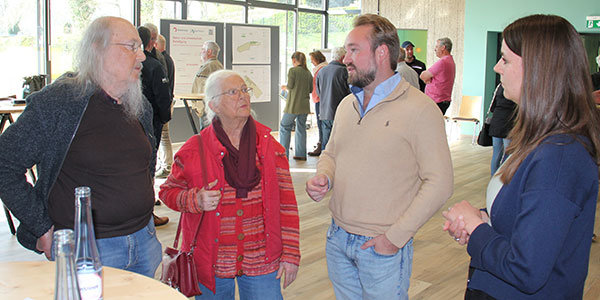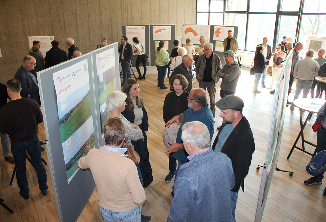 RheinEnergie und AggerEnergie hatten ihre Fachleute auf die verschiedenen Themenbereiche verteilt. Es gab generelle Informationen über die Solartechnik, über das Planungs- und Genehmigungsverfahren oder den Natur- und Umweltschutz. Besonders um die Visualisierungen sammelten sich die Bürger und diskutierten angeregt über die Grafiken, wie sich die Landschaft rund um die Asbacher Dörfer verändern könnte. Auch zur Standortauswahl wurde sich nochmal geäußert. Die Flächen seien besonders geeignet, da der Eigentümer der Flächen – der Landwirt Klaus Schumacher - gleichzeitig auch deren Bewirtschafter ist. „So werden keinem anderen landwirtschaftlichen Betrieb Pachtflächen für die Bewirtschaftung entzogen. Vielmehr wird der landwirtschaftliche Betrieb des Eigentümers durch die Verpachtung in seinem Fortbestand unterstützt.“