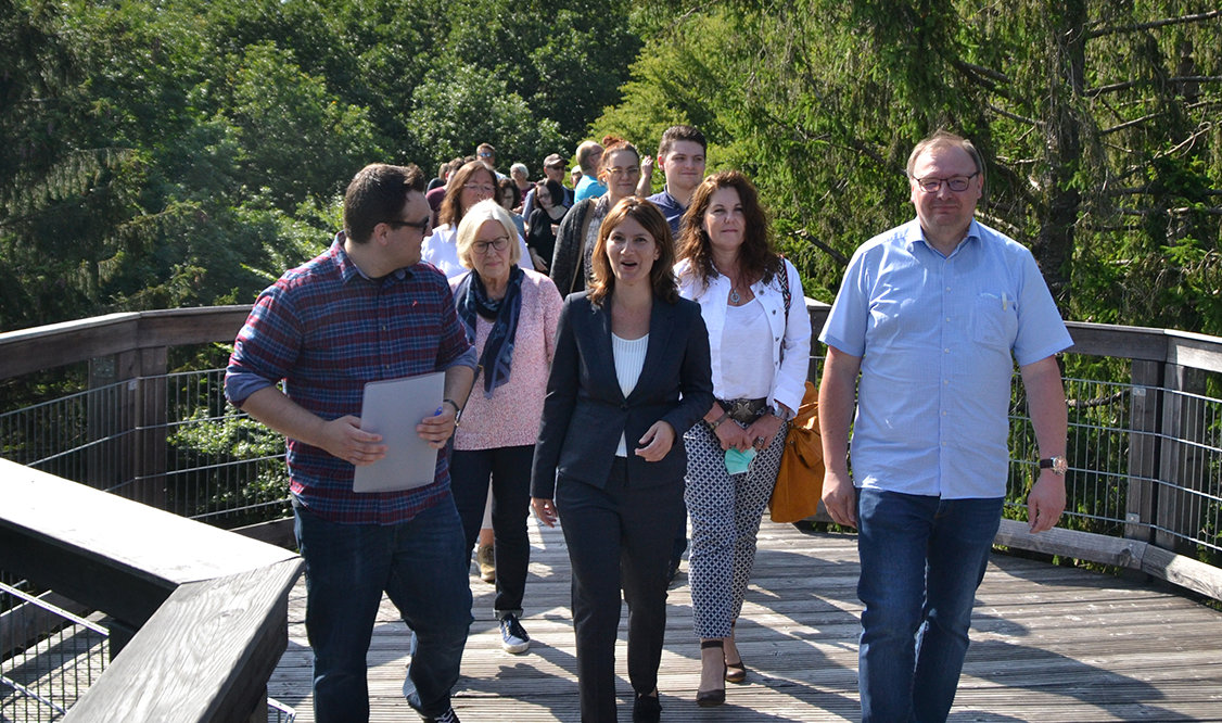 Eingeladen zu der Auftaktveranstaltung im Kreissüden waren mehrere Mitglieder aller drei Parteien zu einem Spaziergang über den Baumwipfelpfad des Naturerlebnisparks sowie auf den 40 Meter hohen Aussichtsturm. Auf der 1,6 Kilometer langen Strecke waren fünf Stationen aufgebaut worden, an jeder wurde über eines der fünf strategischen Ziele referiert, mit denen sich Durdu im anstehenden Wahlkampf gegenüber dem amtierenden Landrat Jochen Hagt positionieren will.