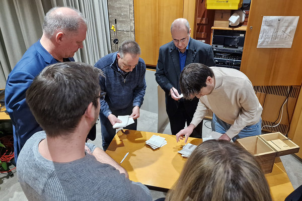 [Foto: Peter Notbohm --- Vertreter aller Parteien zählten die Stimmzettel der geheimen Abstimmung aus. Der CDU-Fraktionsvorsitzende Jörg Jansen schloss aus, dass einer drei Abweichler aus Reihen der Union stammte.]