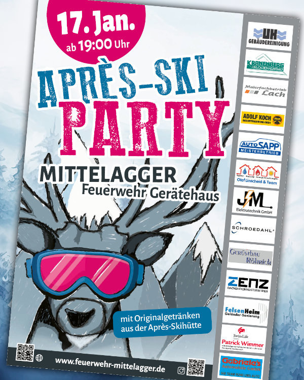 Die Freiwillige Feuerwehr Mittelagger lädt am 17. Januar zum diesjährigen Feuerwehrfest an das Feuerwehrhaus Mittelagger (Steinaggertal 27) ein. Unter dem Motto „Après-Ski-Party“ geht es um 19 Uhr los.
