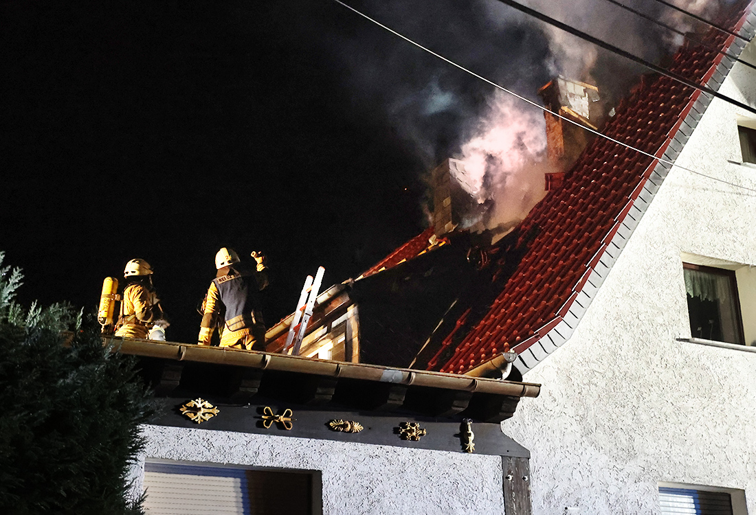 Kurz nach Mitternacht wurde die Feuerwehr Reichshof zu einem Dachstuhlbrand nach Obersteimel gerufen. In einem Zweifamilienhaus in der Steimeler Straße war es zu einem Brand im Obergeschoss gekommen, das sich auf den Spitzboden und den Dachbereich ausgedehnt hatte. „Als wir ankamen, schlugen schon die Flammen aus dem Dachstuhl“, sagte Christoph Dick, Leiter der Reichshofer Feuerwehr.
