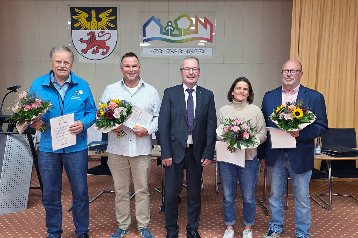 Die Ausübung eines Ehrenamts ist inzwischen längst keine Selbstverständlichkeit mehr, gewinnt in der heutigen Zeit aber zunehmend an Bedeutung. Um ehrenamtliche Tätigkeiten zu würdigen, hat die Gemeinde Reichshof auch in diesem Jahr wieder den Ehrenamtspreis verliehen. Mit ihm werden Menschen gewürdigt, die sich in besonderer Weise für das Gemeinwohl engagieren und das Miteinander im Ort mit Ideen, Tatkraft und Herz bereichern. Mit Sina Klein-Schlegel, Ralf Langheim, Jürgen Seynsche und dem Bürgerbusverein Reichshof (vertreten durch den Vorsitzenden Johannes Heister) wurden im Rahmen der Gemeinderatssitzung vier verdiente Reichshofer Bürger bzw. Institutionen mit der Ehrenamtsmedaille ausgezeichnet.