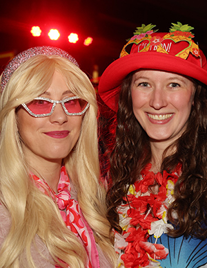 [Farbenfroh kostümiert genießen zwei Besucherinnen die KPG-Party in Eckenhagen.]