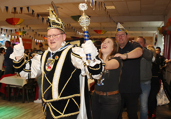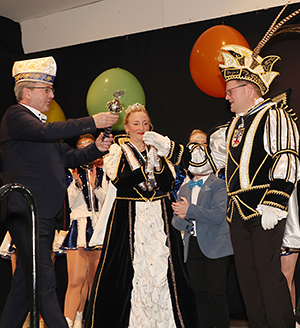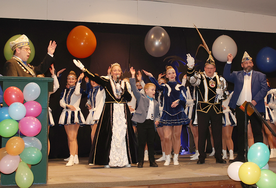 Mit dem Auftritt der Großen Prinzengarde näherte sich später der Höhepunkt des Abends. Flankiert vom erweiterten Vorstand und dem Gefolge bahnten sich Prinz Christian I. aus dem Hause Braun und Prinzessin Steffi den Weg durch das Spalier des begeisterten Publikums in Richtung Bühne. Mit launigen Worten skizzierte der Präsident die neue Regenten, die erst ganz frisch zum Verein gehören.