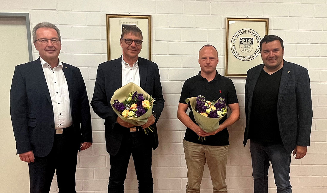Foto: Gemeinde Reichshof --- Bürgermeister Rüdiger Gennies (v.li.), Armin Leienbach (neuer Schiedsmann), Christian Hunger (bisheriger Schiedsmann) und Markus Pollmann, Leiter Ordnungsamt.
