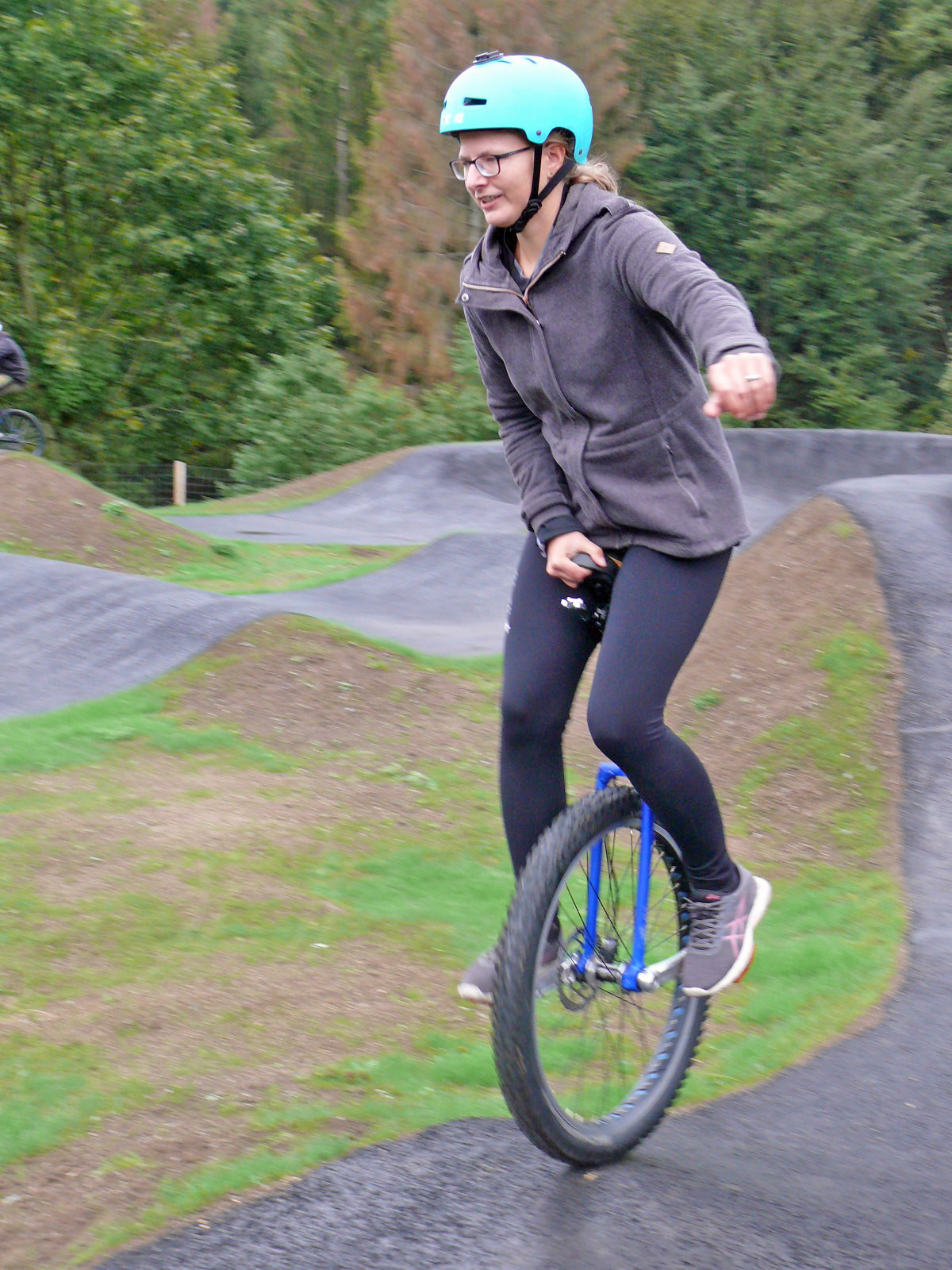 [Selbst für Einrad-Weltmeisterin Lalenia Hirte stellte der neue Pumptrack eine anspruchsvolle Herausforderung dar, denn bei Einrädern wird die Drehung der Pedale, ohne Freilauf, eins zu eins auf das Rad übertragen.]