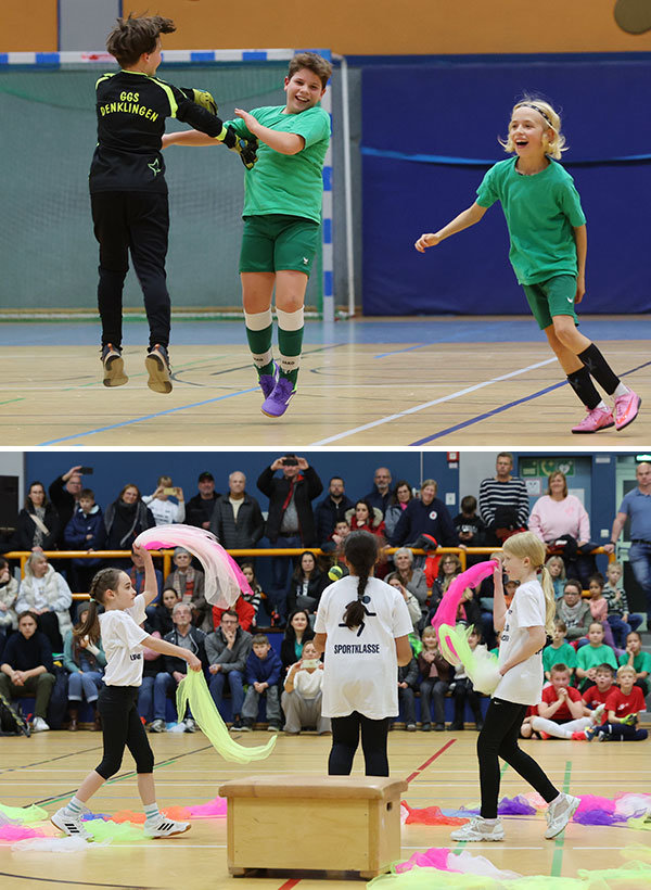 [Groß war der Jubel bei den Nachwuchsfußballern der GGS Denklingen (oben). Die Sportklasse 5b der Gesamtschule Reichshof präsentierte sportliche Einlagen (unten).]