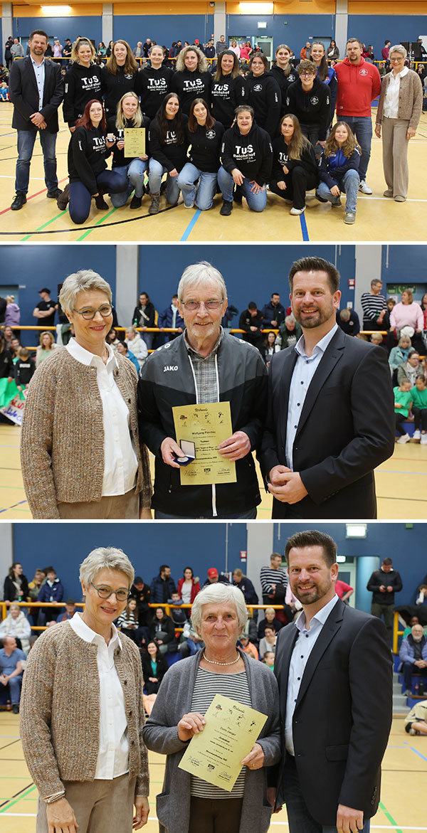 [Bürgermeister Jan Gutowski und Susanne Schneider ehrten zahlreiche Sportler und Ehrenamtler. Den Fußballerinnen des TuS Reichshof gelang der Aufstieg in die Kreisliga A (oben), Wolfgang Patschke ist seit 40 Jahren für die Tischtennisabteilung verantwortlich (Mitte) und Doris Jaeger errang bereits zum 45. Mal das Deutsche Sportabzeichen (unten).]