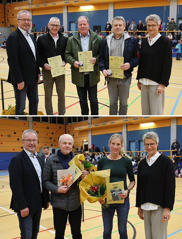 [Ralf Höhler (oben 2.v.l.n.r.), Thomas Funke und Andreas Fischer wurden für ihre langjährige Vorstandsarbeit von Bürgermeister Rüdiger Gennies (l.) und Susanne Schneider (r.) ausgezeichnet. Meinolf Koch und Ira Achenbach erhielten den goldenen Ehrenpreis zusätzlich.]