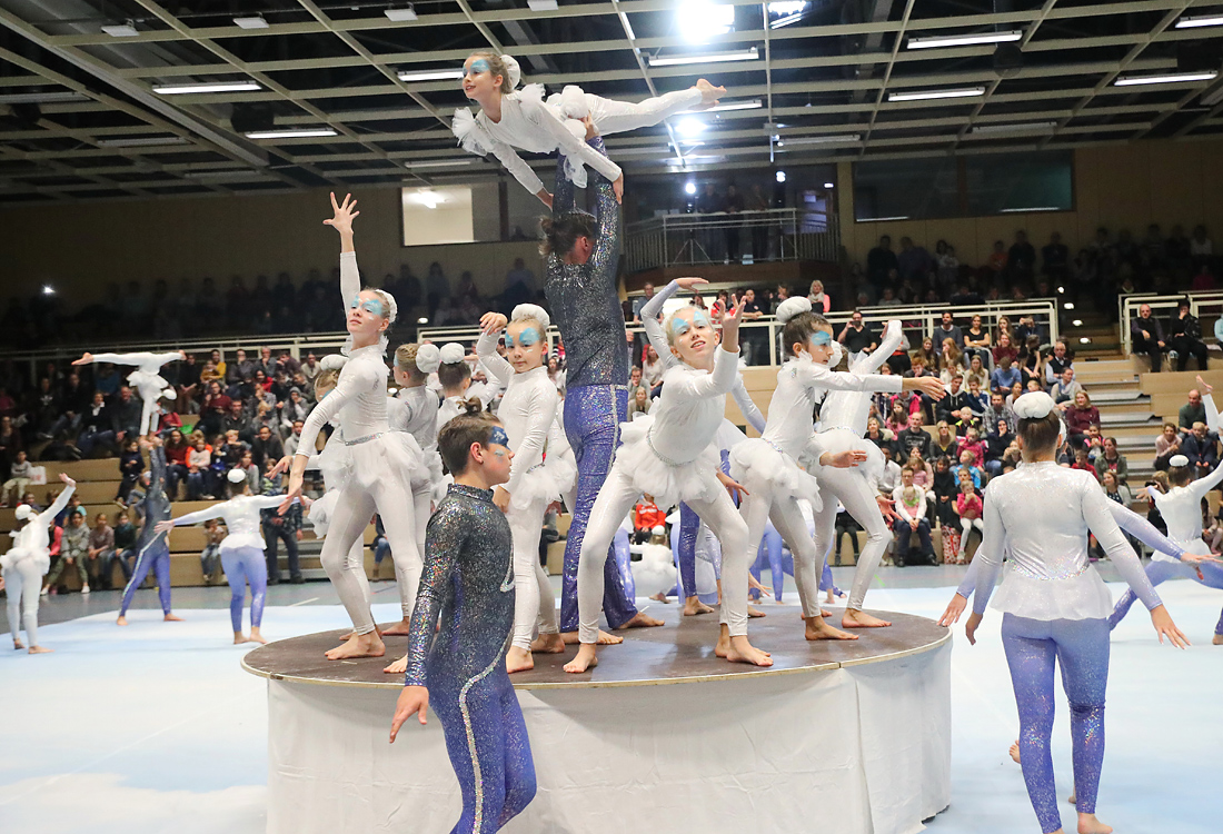Nach einer Begrüßung durch den 1. Vorsitzenden des SSVB, Detlef Kämmerer, begann auch schon die Rhönrad-Aufführung des TV Rodt-Müllenbach unter der Leitung von Claudia Montag. Anschließend bezauberte die Eltern-Kind-Gruppe des TV Kleinwiedenest die Zuschauer mit ihrer Darbietung „Papa ist der Beste“, in der verschiedene Väter mit ihren kleinen Töchtern mitwirkten. Das nächste große Highlight war der Auftritt der Fliegenden Homberger, die die erste von zwei Aufführungen des Abends zeigten. Eine grandiose Showturnvorführung, welche von Ronja und Stephanie Dortelmann entwickelt wurde. Die Homberger feiern auch international Bekanntheit und Erfolge, wie zuletzt Silber bei der Weltmeisterschaft 2017 (World Gym for Life Challenge) in Oslo.
