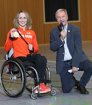 Als besonderer Gast wurde Annika Zeyen, Paralympics-Siegerin im Rollstuhlbasketball und Weltmeisterin im Para-Radsport, begrüßt. Die 34-Jährige gewann mit der Nationalmannschaft 2012 die Goldmedaille bei den Paralympics. Beim Sportabend sprach sie über ihren Werdegang und erzählte aus ihrem Leben. Interviewt wurde sie dabei von Friedhelm Julius Beucher, der seit 2009 als Präsident des Deutschen Behindertensportverbandes tätig ist.