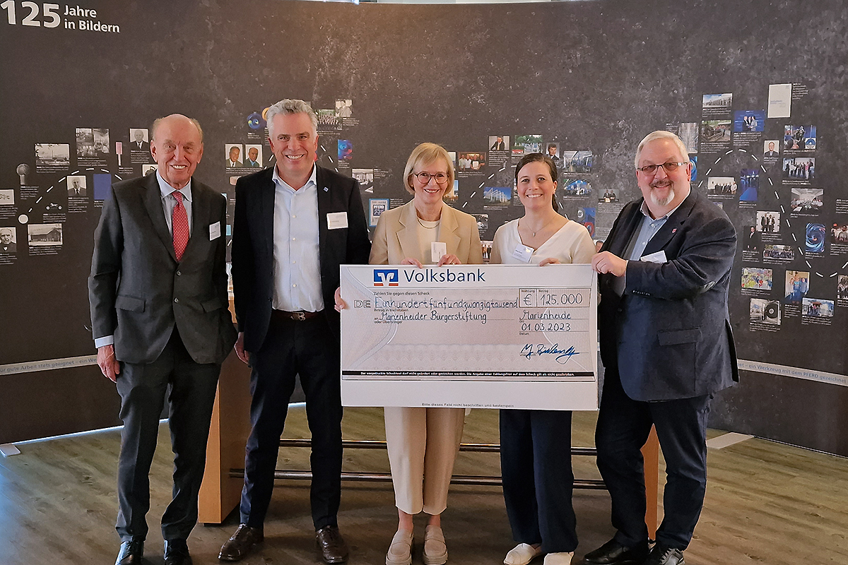 Marienheide – Anlässlich des 125-jährigen Bestehens spendet die Firma Rüggeberg eine stolze Summe an die Marienheide Bürgerstiftung – Großer Teil des Geldes soll für Schwimmunterricht eingesetzt werden.