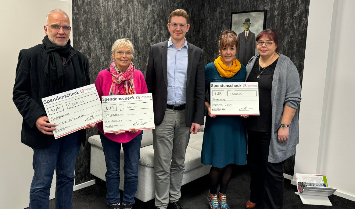 Das Immobilienunternehmen Christian Borch in Wiehl-Bielstein hat insgesamt 15.000 Euro an drei wohltätige Organisationen gespendet. Jeweils 5.000 Euro gingen an die Initiative "Mamma CAMPY", die Diakonie Michaelshoven/Wohnhilfen Oberberg und an Nina+Nico. Mamma CAMPY bietet Hilfe für Krebspatienten, die Diakonie Michaelshoven/Wohnhilfen Oberberg engagiert sich für soziale Belange, insbesondere für die Wohnungslosenhilfe, und bei Nina+Nico setzt man sich für von Gewalt betroffene Mädchen, Jungen und Frauen ein.