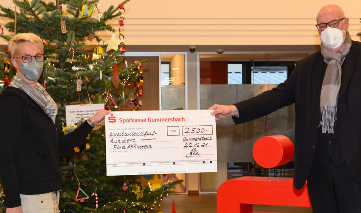 Die Sparkasse Gummersbach versendete ihre Kunden-Weihnachtsgrüße in diesem Jahr als elektronische Post per E-Mail und verknüpfte diese mit einem sozialen Zweck: Für jeden Klick ihrer Kunden versprach sie, fünf Euro an den „FördAHRverein“ zugunsten der Flutopfer im Ahrtal zu spenden. Nun hat Frank Grebe, Vorstandsvorsitzender der Sparkasse Gummersbach, laut einer Mitteilung das Versprechen eingelöst und übergab 2.500 Euro an die Sparkassen-Mitarbeiterin Elke Weiss.