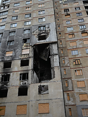 [An zahlreichen Gebäuden in Charkiws Außenbezirken Richtung Front gebe es Schäden.]