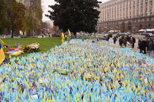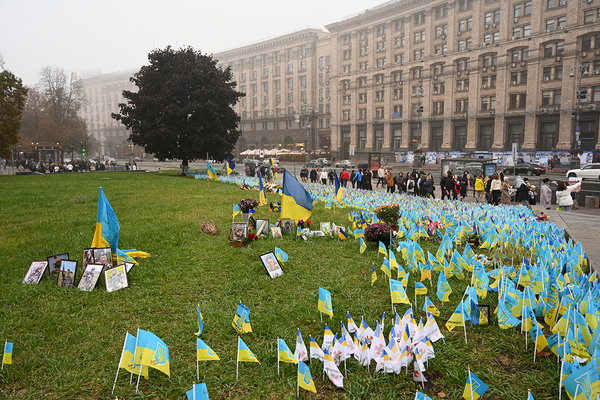 [In Kiew haben Rolf Kühr und Igor Prudkov den Majdan-Platz aufgesucht und dabei zahlreiche Fähnchen zum Gedenken an getötete Soldaten gesehen.]