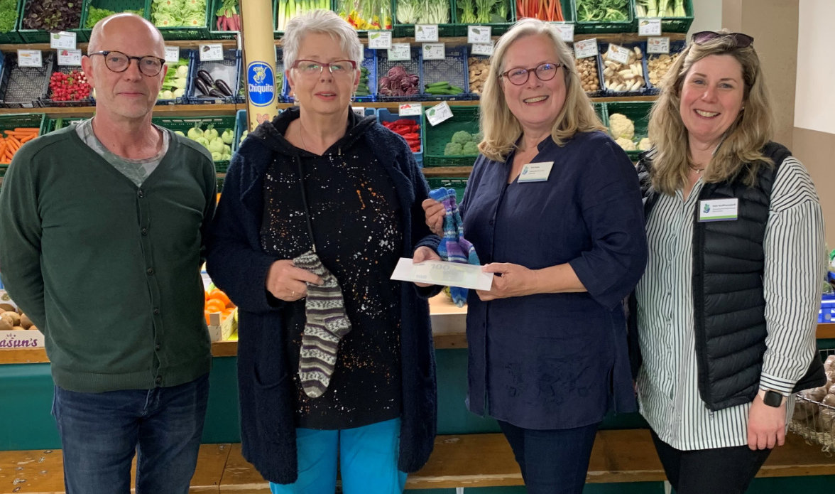 Erfreut sind Dorit Knabe und Nele Wolfframsdorff vom Vorstand der Ökumenischen Hospiz-Gruppe Marienheide über die Spende in Höhe von 600 Euro, die ihnen Angelika Bartknecht überreichte. Bartknecht strickte Socken, legte die Endprodukte im Obst- und Gemüsegeschäft von Axel Rauin aus und gab sie gegen eine Spende für die lokale Hospizarbeit ab. „Dieses Engagement für Menschen, die in Krisen, in Trauer und am Lebensende auf Unterstützung und Begleitung angewiesen sind, finden wir beispielhaft", sagte Dorit Knabe bei der Übergabe im Geschäft. Nele Wolfframsdorff ergänzte, wie wertvoll jede Spende besonders für die Trauerarbeit in Marienheide ist, da diese nicht durch die Krankenkassen gefördert wird.