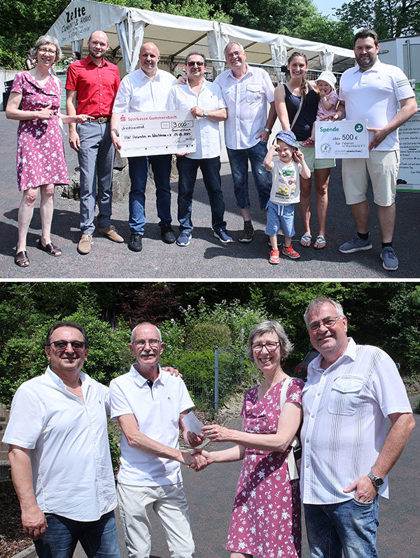 [Eine Spende der Sparkasse Gummersbach in Höhe von 3.000 Euro hatte Bürgermeister Matthias Thul mitgebracht und der Boxring Bergneustadt überreichte in Person von Constantin Kierspol und Carolin Besting 500 Euro (Foto oben); Hrachya Shaljyan freut sich über den „Umschlag“ von Detlef Kämmerer ebenso wie seine Vorstandskollegen Mechthild Glunz und Karl-Heinz Andree (Foto unten, v.li.).]