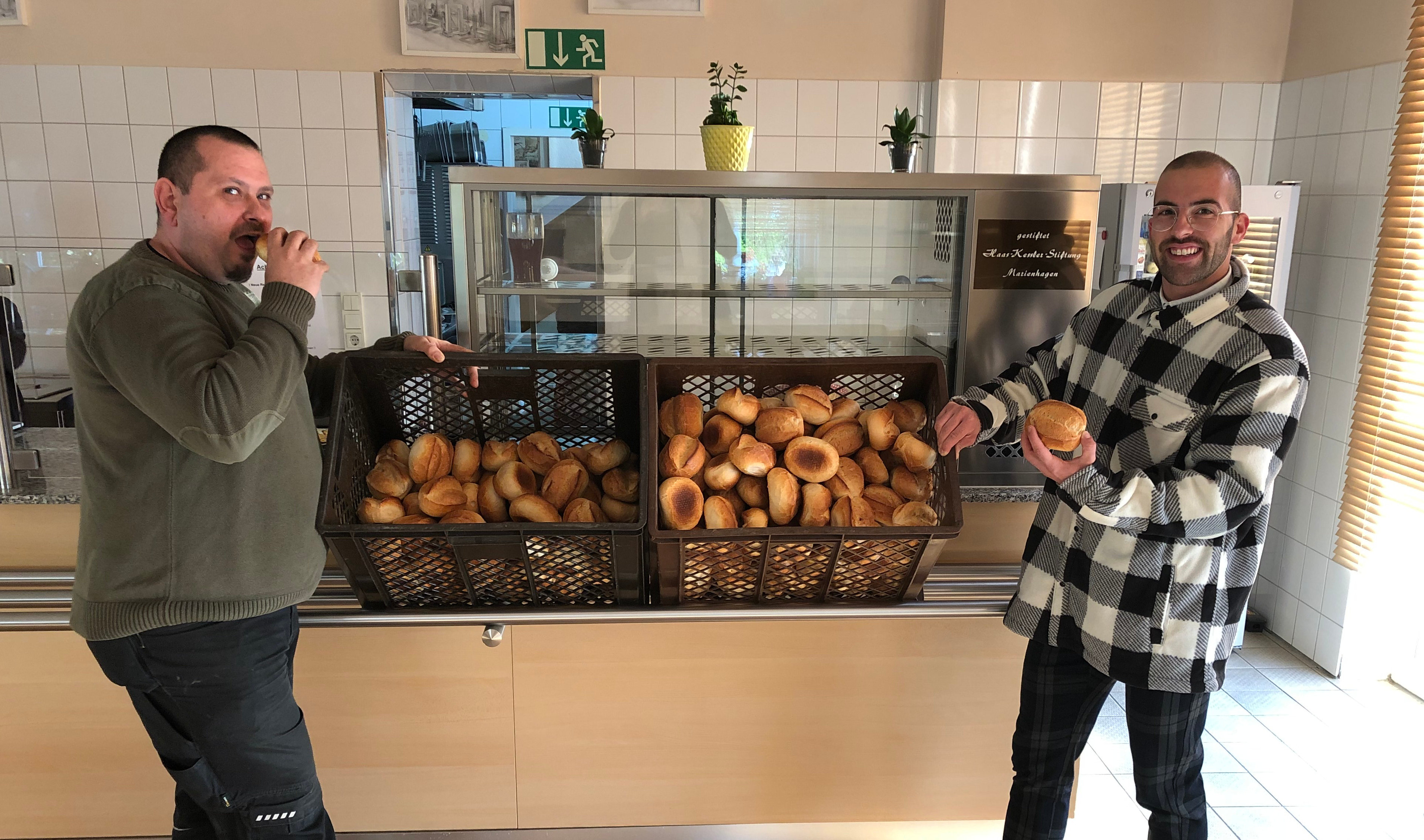 [Zwei Kisten voll mit frischen Brötchen warteten auf die Bedürftigen.]