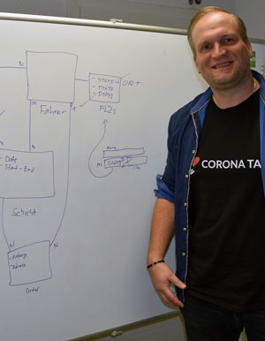 Inzwischen sind alle Programmierer bei „Kiwis &Brownies“ im Homeoffice, die Skizzen auf dem Sideboard im Raum zeugen allerdings noch von den Plänen, welche Braun (Foto) und seine Kollegen eigens für die Logistik des Corona Taxis entwickelt haben. Mit der Software werden sowohl die Bestellungen als auch die benötigten Daten für die freiwilligen Unterstützer gebündelt und automatisch verarbeitet. Nach der Besprechung legt Fahrer Sadic Cam die soeben erhaltene FFP2-Maske auf den Beifahrersitz seines Autos und macht sich auf den Weg zum Wochenmarkt nach Bergneustadt.