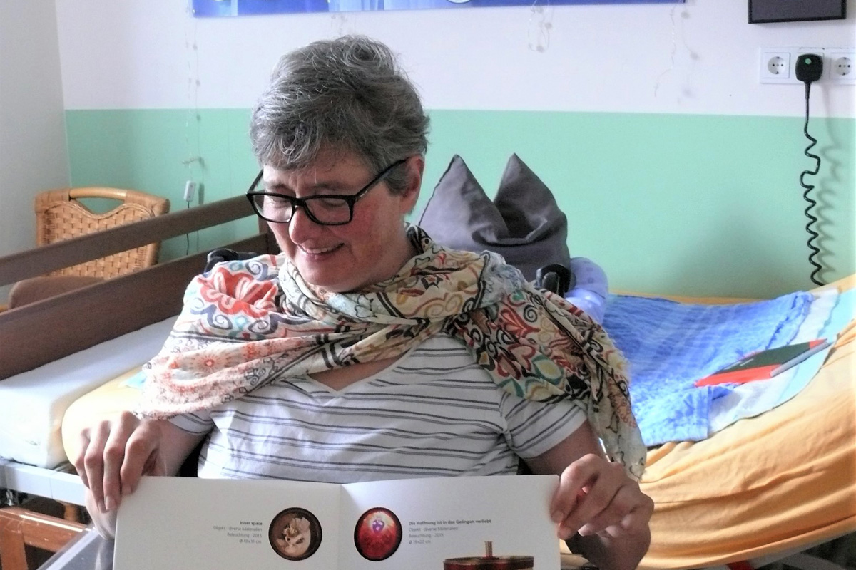 Die Patienten leben in Einzelzimmern, die liebevoll mit persönlichen Details aus „ihrem Leben davor“ eingerichtet sind. Bei Künstlerin Dorothea schmückt eine Installation aus ihrem künstlerischen Schaffen die Wand über dem Pflegebett. Natürlich hängen dort auch Portrait-Fotos von sich, ihrem Mann und den Söhnen. Nicht fehlen darf ihr Kunst-Katalog mit dem Titel „Spionoptikum“. Er zeigt von ihr gestaltete kleine bis mittelgroße Gehäuse, die wie ein Türspion einen Blick von außen nach innen ermöglichen. Solch ein „Spionoptikum“ gewährt Einsicht in einen sonst verborgenen kleinen Raum und macht Gedanken, Gefühle und prägende Ereignisse sichtbar.