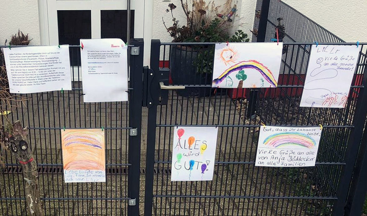 Den Kindern wurde vorgeschlagen, Grußbotschaften an ihre Freunde zu verfassen. Diese wurden dann in den Briefkasten am Kindergarten geworfen. Daraus entstand die Idee, einen zweiten In einem zweiten Brief an die Kita-Kinder zu schreiben, in dem sie zum Malen und Grüßen angeregt wurden. Die Resonanz war groß: Mittlerweile schmücken den Zaun an der Kita im Stadtteil Hackenberg bunte Regenbogen, geschriebene Grüße und Bilder mit Bäumen und Blumen.