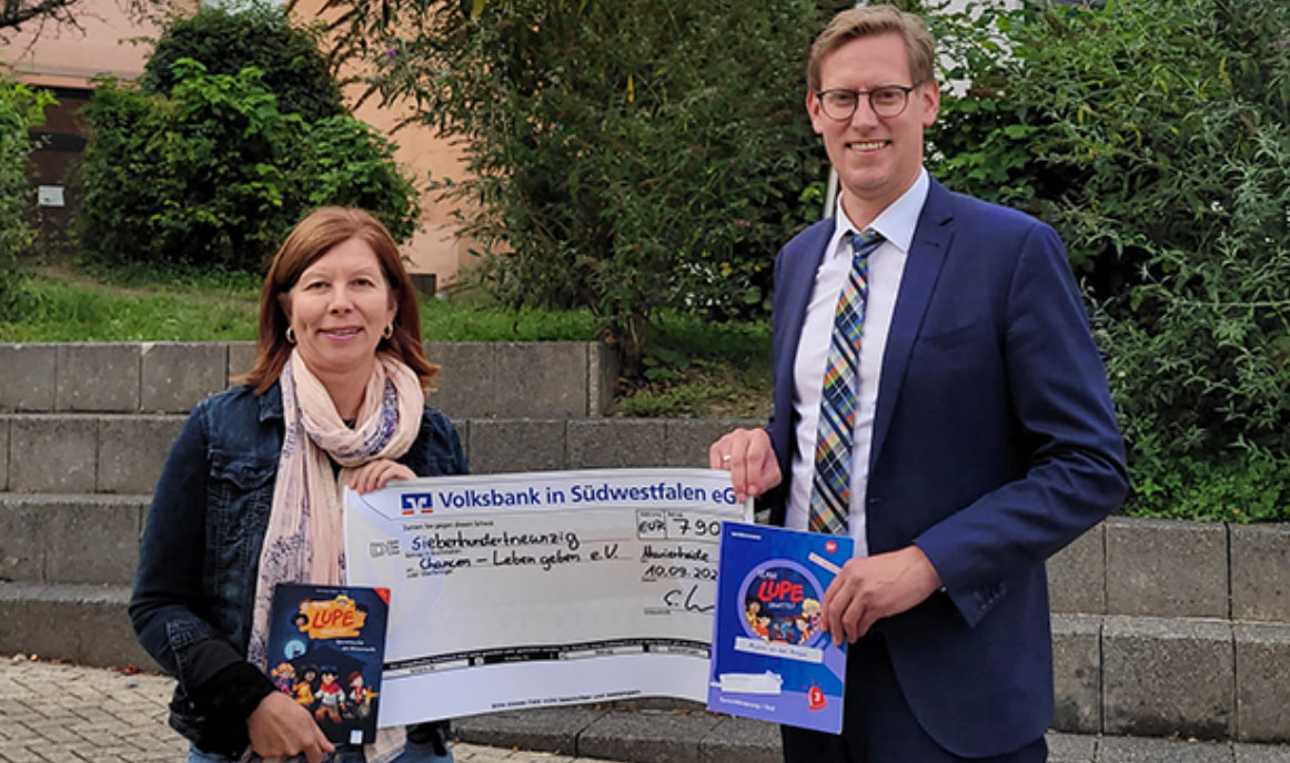 An der Grundschule Marienheide startet ein neues Vorhaben. Einen Spendenscheck über 790 Euro nahm dafür Barbara Kutschaty vom Verein "Chancen - Leben geben" vom Vorstandsvorsitzenden der Marienheider Bürgerstiftung, Sebastian Heimes, entgegen. In Kürze startet an der Schule das Leseförderprojekt „Team Lupe“, in Zusammenarbeit mit der Nachhilfeschule „Übungsmeister“. „Wir sind sehr dankbar für diese Unterstützung, denn dadurch ist die Verwirklichung erst möglich“, sagte Kutschaty.