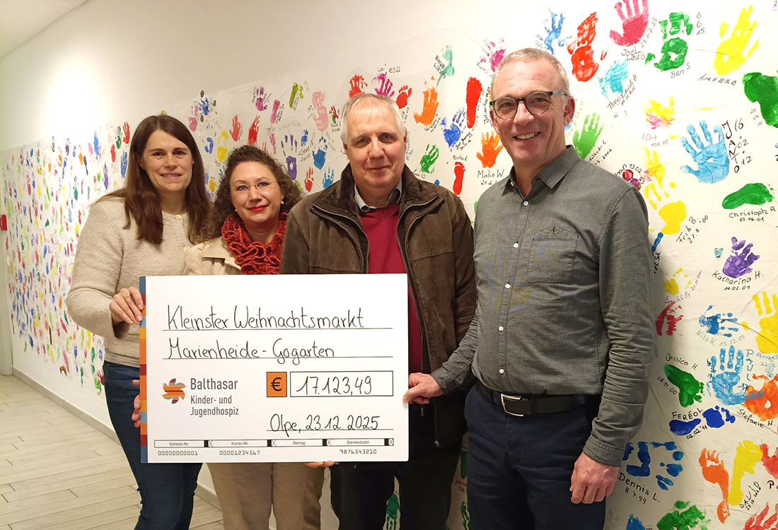 Schon im vergangenen Jahr konnte sich das Ehepaar Sonja und Ralf Haase über einen Spendenbetrag von etwas mehr als 10.000 Euro freuen, den sie an das Kinderhospiz Olpe überreichten. Zusammengekommen war das Geld auf ihrem „kleinsten Weihnachtsmarkt“ im Oberbergischen Kreis in Marienheide-Gogarten vor ihrem Haus. In diesem Jahr freuen sich Sonja und Ralf Haase nun über einen neuen Spendenrekord. Auf den Cent genau 17.123,49 Euro ließen Besucherinnen und Besucher da, dafür wechselten weihnachtliche Köstlichkeiten und Waren den Besitzer. „Der große Andrang und die positive Resonanz der Besucherinnen und Besucher haben uns sehr gefreut und gezeigt, wie wichtig eine gemeinsame Unterstützung ist“, schreibt das Ehepaar in einer Mitteilung nach der Übergabe der Spenden, die traditionell wieder zu 100 Prozent an das Kinderhospiz in Olpe ging.