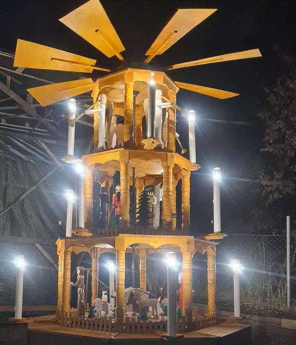 Das Konzept kam so gut an, dass in den vergangenen Jahren immer mal wieder kleinere Attraktionen hinzukamen. Zu sehen gab es in diesem Jahr vom 29. November bis zum 21. Dezember eine lebensgroße Krippe, eine 4,50 Meter hohe Pyramide und Holzschlitten. Durch die Lichteranlage ließen die Haases den Stand schon von weitem erstrahlen. Neu in diesem Jahr war ein noch größerer Weihnachtsbaum und eine Fotowand mit „Rudolph“. Am Besten angekommen bei den Besuchern sei laut Haase die stündliche Lichtershow, die im Takt der Musik läuft, ebenso wie die selbstgebaute Weihnachtspyramide.