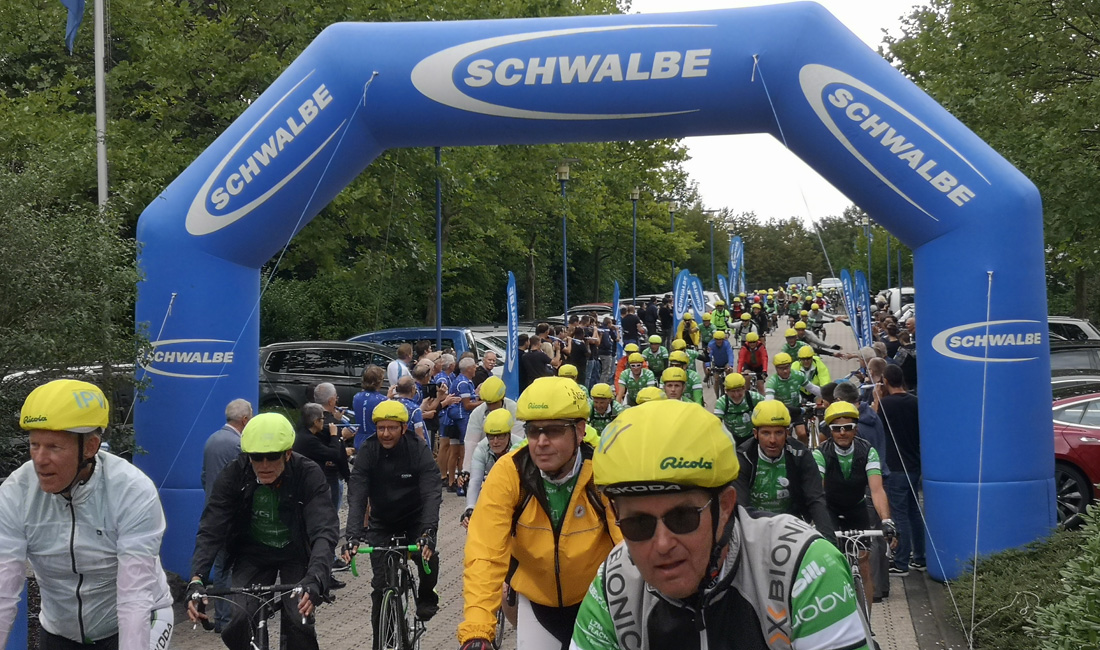 Vom Weltmeister im Fußball, über die Olympiasiegerin im Biathlon, den zahlreichen Welt- Europa- Deutschen und DDR-Meistern, zu Trägern des Gelben Trikots bei der Tour de France bis hin zum Star aus Show und Fernsehen: Es war ein imposantes Bild, das sich heute in Reichshof-Wehnrath bot. Hier legte die Tour der Hoffnung auf dem Firmengelände der Firma Schwalbe einen Zwischenstopp auf ihrer heutigen Etappe ein und wurde von rund 150 begeisterten Mitarbeitern empfangen. Bereits seit 1983 sammelt die Organisation mit der jährlich ausgetragenen Fahrrad-Tour Spendengelder zugunsten krebs- und leukämiekranker Kinder.