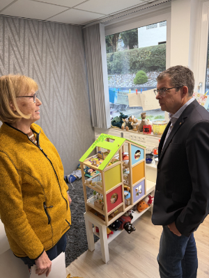 Der Manager überließ zudem nützliche Möbel wie Schreibtische sowie Schränke und hat den engagierten Mitarbeiterinnen noch einen besonderen „Eyecatcher“ vermacht: das Aquarium im Empfangsbereich. „Die Fische haben schon Namen und stehen bei den Kindern hoch im Kurs“, berichtet Weispfennig beim Rundgang mit Helmenstein, der sich ein Bild von den nun final gestalteten Räumlichkeiten macht. Auf den rund 120 Quadratmetern sind Büroräume, Aufenthalts- und Rückzugsmöglichkeiten entstanden. Das „Herzstück“ aber ist der sogenannte Resilienzraum, wo die Klienten sich haptisch betätigen dürfen, Bilder malen oder einfach spielen können. Ein zentrales Thema des Angebots.